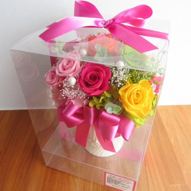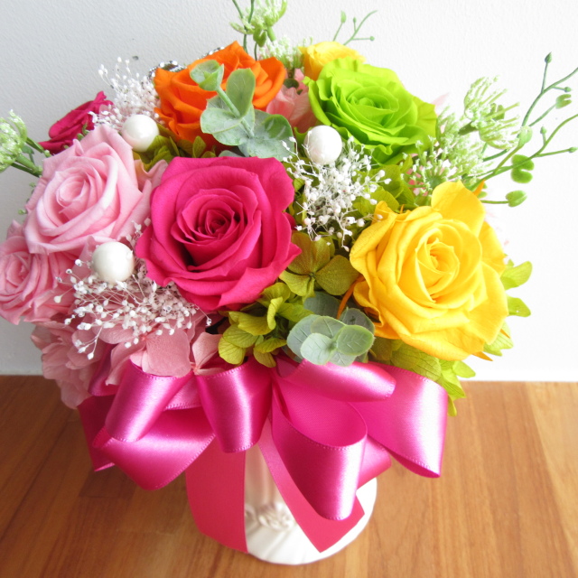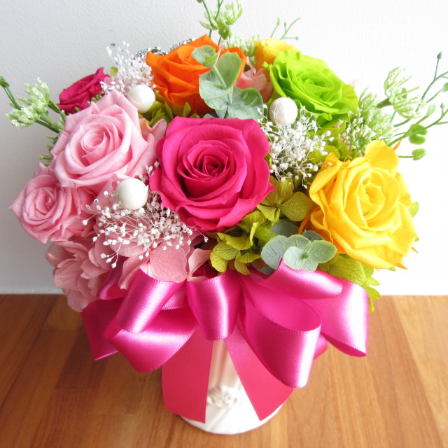 カラフルで華やかなミックスカラー系のバラのプリザーブドフラワーアレンジです。