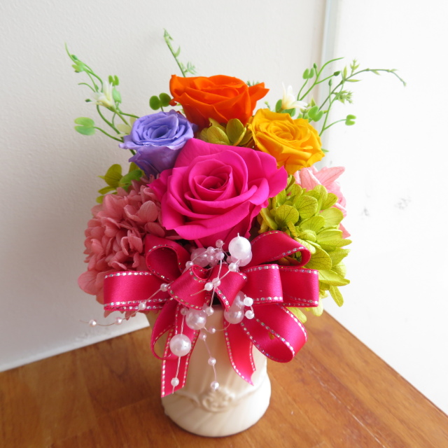 カラフル系の色合いが華やかなプリザーブドフラワーアレンジです。
