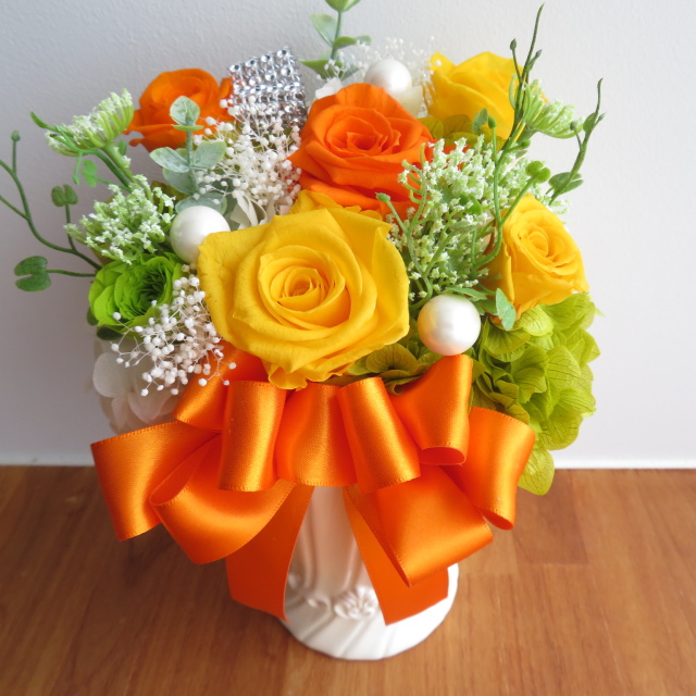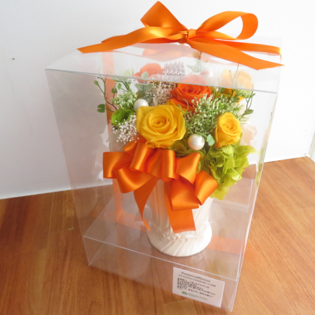 プリザーブドフラワーです。明るい花色は元気と笑顔を届けてくれます。