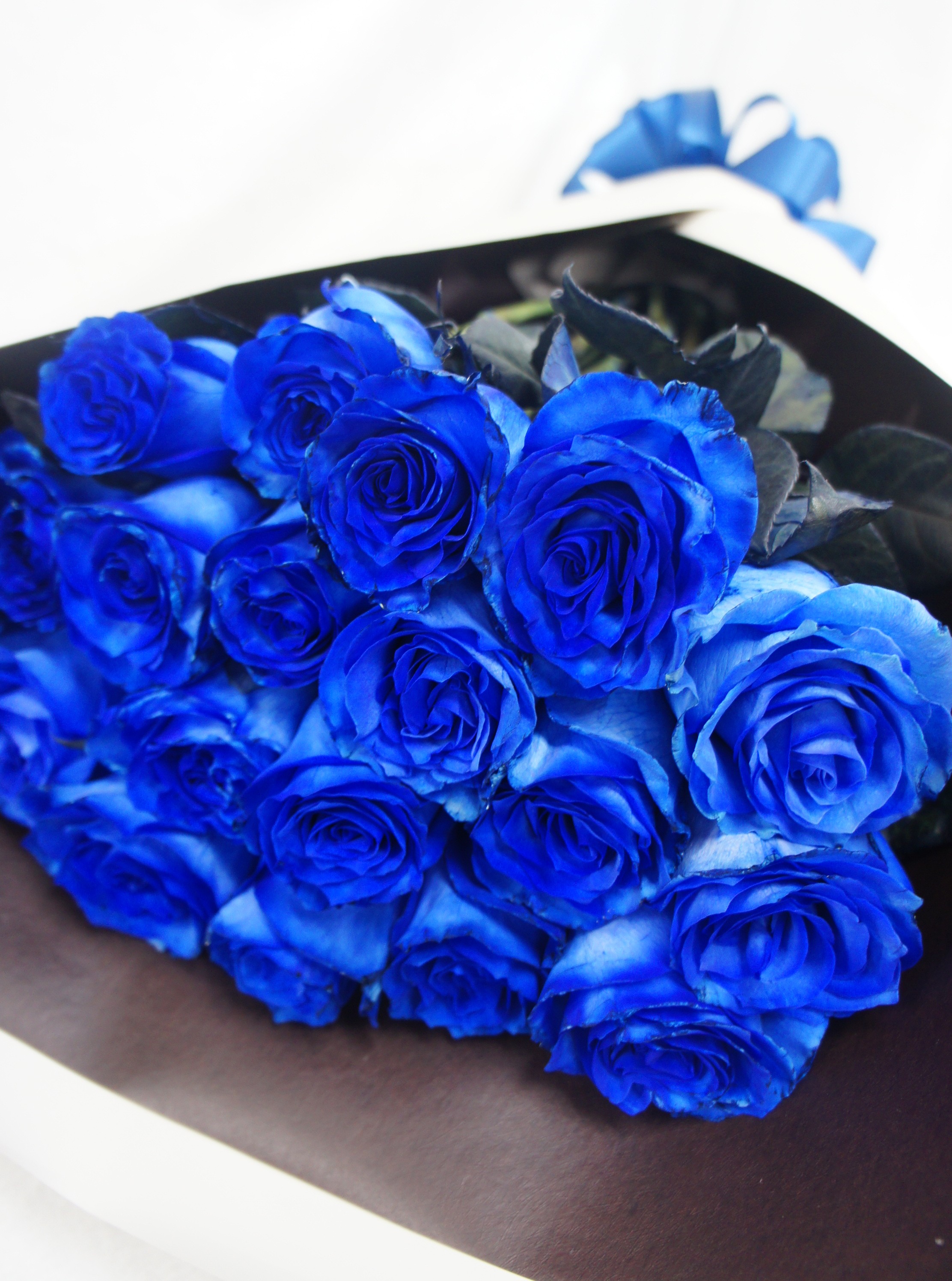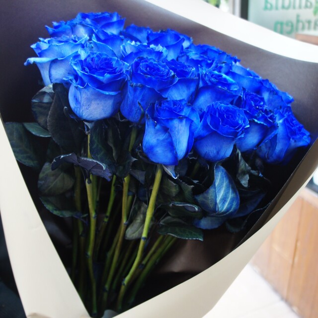 クールで知的な印象の青いバラの花束です。