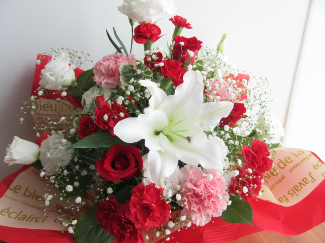 爽やかな白のユリに情熱的なバラやカーネーション、花持ちの良いトルコキキョウを合わせた思わず微笑みがこぼれるフラワーアレンジです。