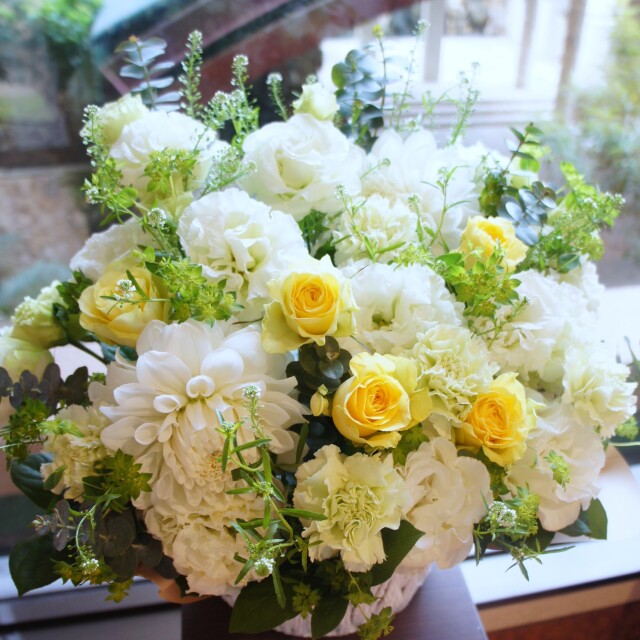 白グリーンにイエローのバラを合わせたフラワーアレンジです。