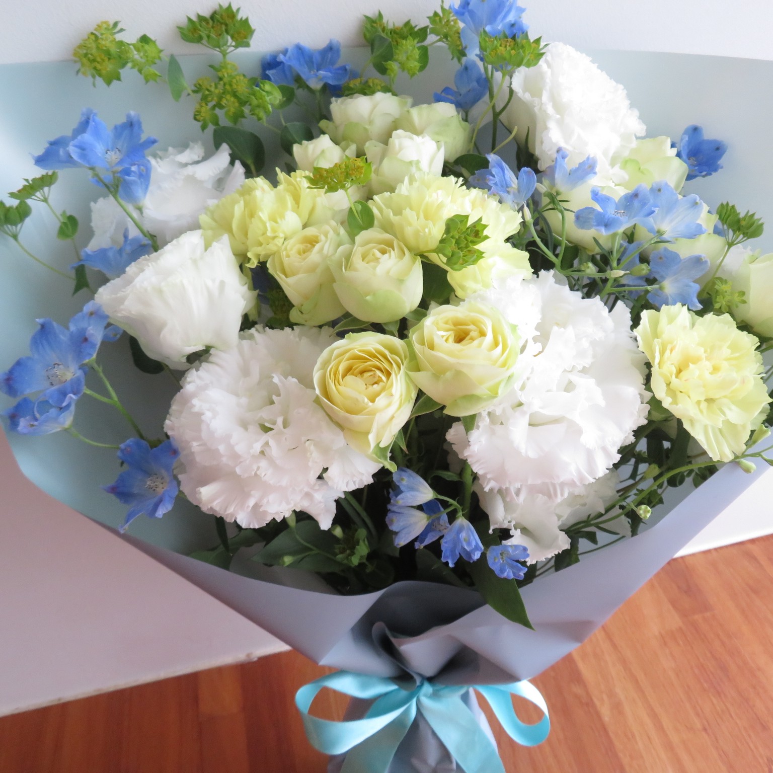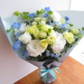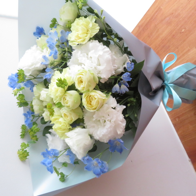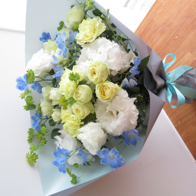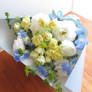 ライトイエローバラや涼し気な白のトルコキキョウやライトブルーを合わせた花束です。