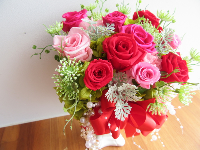 ホットピンクのバラや赤いバラが鮮やかなフラワーアレンジメントです